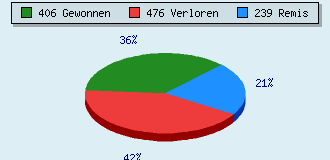 0 Partien am laufen 1121 Partien beendet 406 Partien gewonnen: 35 durch Matt 322 durch Aufgabe 46 durch Zeitüberschreitung 3 durch Abbruch 476 Partien verloren: 2 durch Matt 436 durch Aufgabe 38 durch Zeitüberschreitung (= 3.4% ZÜ-Quote) 239 Partien remisiert