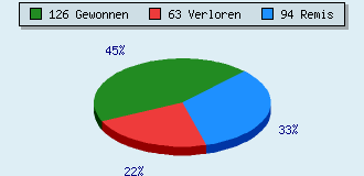 0 Partien am laufen 283 Partien beendet 126 Partien gewonnen: 10 durch Matt 91 durch Aufgabe 25 durch Zeitüberschreitung 63 Partien verloren: 0 durch Matt 61 durch Aufgabe 1 durch Zeitüberschreitung (= 0.4% ZÜ-Quote) 1 durch Abbruch 94 Partien remisiert
