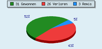 0 Partien am laufen 60 Partien beendet 31 Partien gewonnen: 3 durch Matt 20 durch Aufgabe 8 durch Zeitüberschreitung 26 Partien verloren: 1 durch Matt 23 durch Aufgabe 2 durch Zeitüberschreitung (= 3.3% ZÜ-Quote) 3 Partien remisiert