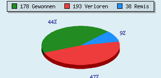 3 Partien am laufen 409 Partien beendet 178 Partien gewonnen: 44 durch Matt 112 durch Aufgabe 22 durch Zeitüberschreitung 193 Partien verloren: 10 durch Matt 162 durch Aufgabe 21 durch Zeitüberschreitung (= 5.1% ZÜ-Quote) 38 Partien remisiert