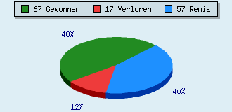 0 Partien am laufen 141 Partien beendet 67 Partien gewonnen: 5 durch Matt 50 durch Aufgabe 10 durch Zeitüberschreitung 2 durch Abbruch 17 Partien verloren: 0 durch Matt 16 durch Aufgabe 1 durch Zeitüberschreitung (= 0.7% ZÜ-Quote) 57 Partien remisiert