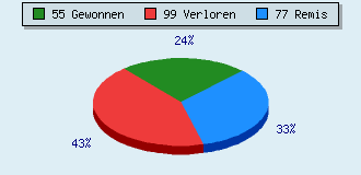 0 Partien am laufen 231 Partien beendet 55 Partien gewonnen: 4 durch Matt 41 durch Aufgabe 10 durch Zeitüberschreitung 99 Partien verloren: 1 durch Matt 45 durch Aufgabe 47 durch Zeitüberschreitung (= 20.3% ZÜ-Quote) 6 durch Abbruch 77 Partien remisiert