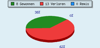 0 Partien am laufen 21 Partien beendet 8 Partien gewonnen: 0 durch Matt 7 durch Aufgabe 1 durch Zeitüberschreitung 13 Partien verloren: 1 durch Matt 12 durch Aufgabe 0 durch Zeitüberschreitung (= 0% ZÜ-Quote) 0 Partien remisiert