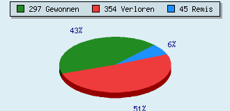 0 Partien am laufen 696 Partien beendet 297 Partien gewonnen: 38 durch Matt 214 durch Aufgabe 45 durch Zeitüberschreitung 354 Partien verloren: 28 durch Matt 252 durch Aufgabe 74 durch Zeitüberschreitung (= 10.6% ZÜ-Quote) 45 Partien remisiert