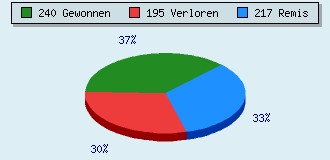47 Partien am laufen 652 Partien beendet 240 Partien gewonnen: 8 durch Matt 177 durch Aufgabe 55 durch Zeitüberschreitung 195 Partien verloren: 0 durch Matt 149 durch Aufgabe 46 durch Zeitüberschreitung (= 7.1% ZÜ-Quote) 217 Partien remisiert