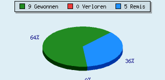 0 Partien am laufen 14 Partien beendet 9 Partien gewonnen: 0 durch Matt 7 durch Aufgabe 2 durch Zeitüberschreitung 0 Partien verloren: 0 durch Matt 0 durch Aufgabe 0 durch Zeitüberschreitung (= 0% ZÜ-Quote) 5 Partien remisiert
