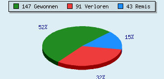 0 Partien am laufen 281 Partien beendet 147 Partien gewonnen: 31 durch Matt 91 durch Aufgabe 25 durch Zeitüberschreitung 91 Partien verloren: 6 durch Matt 67 durch Aufgabe 18 durch Zeitüberschreitung (= 6.4% ZÜ-Quote) 43 Partien remisiert