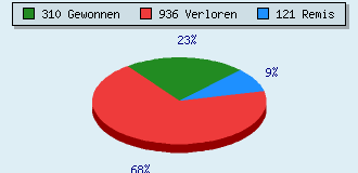 14 Partien am laufen 1367 Partien beendet 310 Partien gewonnen: 45 durch Matt 184 durch Aufgabe 81 durch Zeitüberschreitung 936 Partien verloren: 382 durch Matt 553 durch Aufgabe 1 durch Zeitüberschreitung (= 0.1% ZÜ-Quote) 121 Partien remisiert
