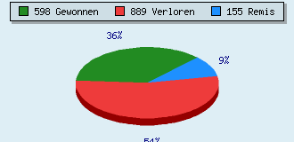 15 Partien am laufen 1642 Partien beendet 598 Partien gewonnen: 150 durch Matt 386 durch Aufgabe 62 durch Zeitüberschreitung 889 Partien verloren: 181 durch Matt 703 durch Aufgabe 5 durch Zeitüberschreitung (= 0.3% ZÜ-Quote) 155 Partien remisiert