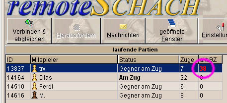 Für eine vergrößerte Ansicht auf die Bilder klicken.  | Hat der Gegner die Bedenkzeit überschritten wird dies deutlich mit roter Farbe in der Partieliste angezeigt. |  | Beim Öffnen des Partiefensters, werden Sie nocheinmal darüber informiert, dass Sie nun die Möglichkeit haben, die BZ zu reklamieren.Dazu erscheint ein sonst nicht sichtbarer Knopf in der Werkzeugleiste des Partiefensters.