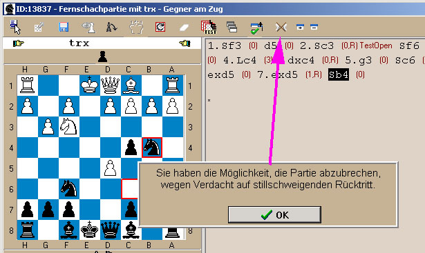 Welches Verfahren zur Anwendung kommt, wird in der Herausforderung bzw. in der Turnierausschreibung angegeben. | | Bedenkzeit reklamieren: | 2. Bedenkzeit reklamierenDer remoteSchach-Server ist in der Lage, auf Bedenkzeitüberschreitungen selbstständig zu reagieren, d.h. gegebenenfalls die Partie wegen BZÜ zu beenden, oder es den Spielern zu überlassen die Bedenkzeit zu reklamieren. Auch dies kann vor Partiebeginn für jede Partie einzeln eingestellt werden bzw. wird vom Turnierleiter festgelegt. 2.1 ... mit dem Client-Programm