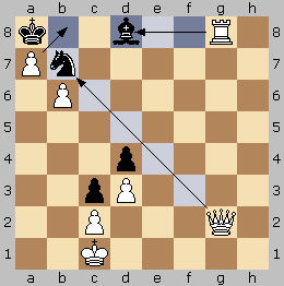 Auch hier ist Schwarz patt, der Springer und der Läufer sind gefesselt, jeweils von der Dame und dem Turm, d.h. sollte der Springer oder der Läufer einen beliebigen Zug machen, so wäre der Konig im Schach. Und der König selber kann auch nicht ziehen, den Bauer vor ihm kann er nicht schlagen, da er vom zweiten Bauern geschützt ist und das Feld neben ihm ist durch den geschützten Bauern angegriffen.